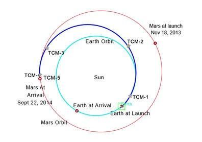 A Hohmann transfer orbit can take a spacecraft from Earth to Mars. The orbit is an elliptical one, where the periapsis is at Earth's distance from the Sun and the apoapsis is at Mars' distance from the Sun. The transfer orbit has to be timed so that when the spacecraft departs Earth, it will arrive at its orbit apoapsis when Mars is at the same position in its orbit. Earth and Mars align properly for a Hohmann transfer once every 26 months. "by Myron Kayton"